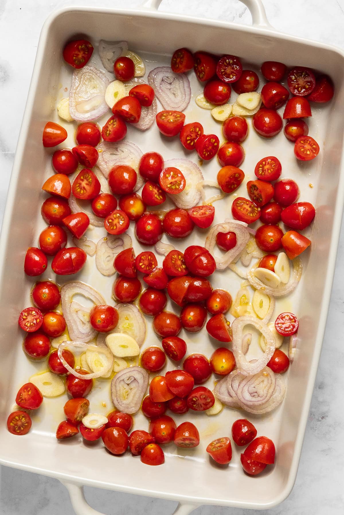 In a baking dish, add the tomatoes, shallot, garlic, salt, and pepper. Drizzle with remaining 2 tablespoons of olive oil and toss to coat.