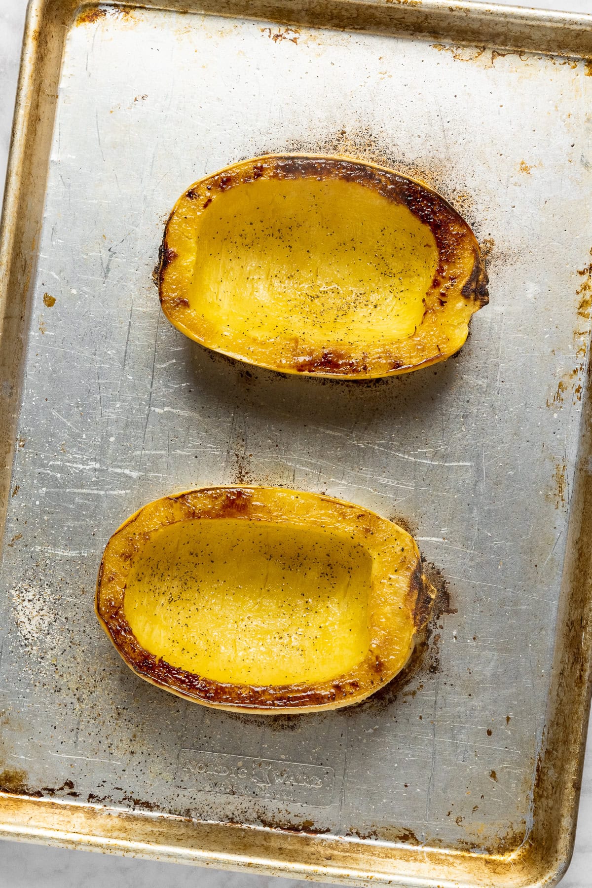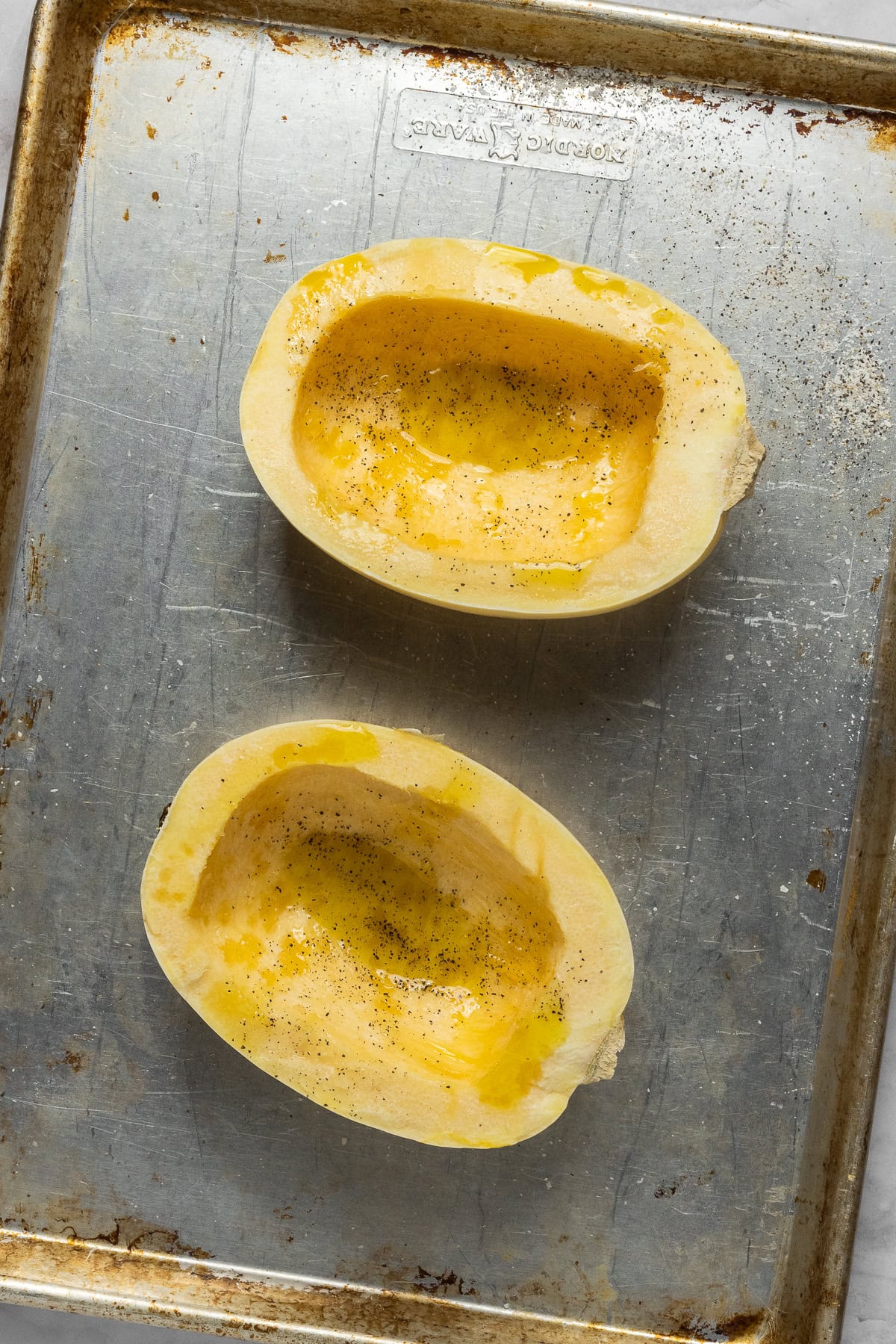 - Cut a spaghetti squash in half vertically. Using a spoon, scoop out the flesh and seeds. Drizzle with 2 tablespoons of the olive oil and sprinkle with salt and pepper. Place the squash cut-side down on a baking sheet and roast in the oven for 45-50 minutes, until the skin can be easily pierced through with a fork.