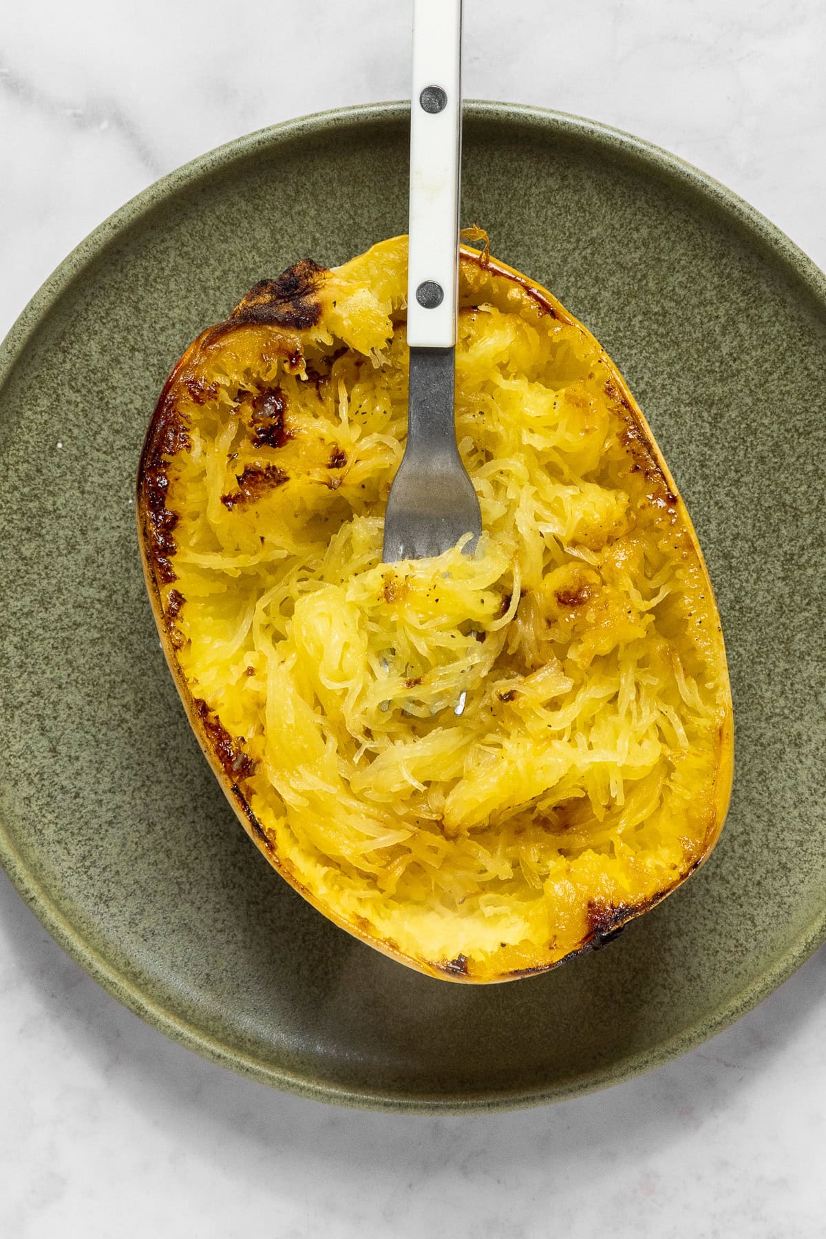 - Once the squash is done cooking, let cool for a few minutes. Using a fork, scrape the spaghetti strands out of the squash.