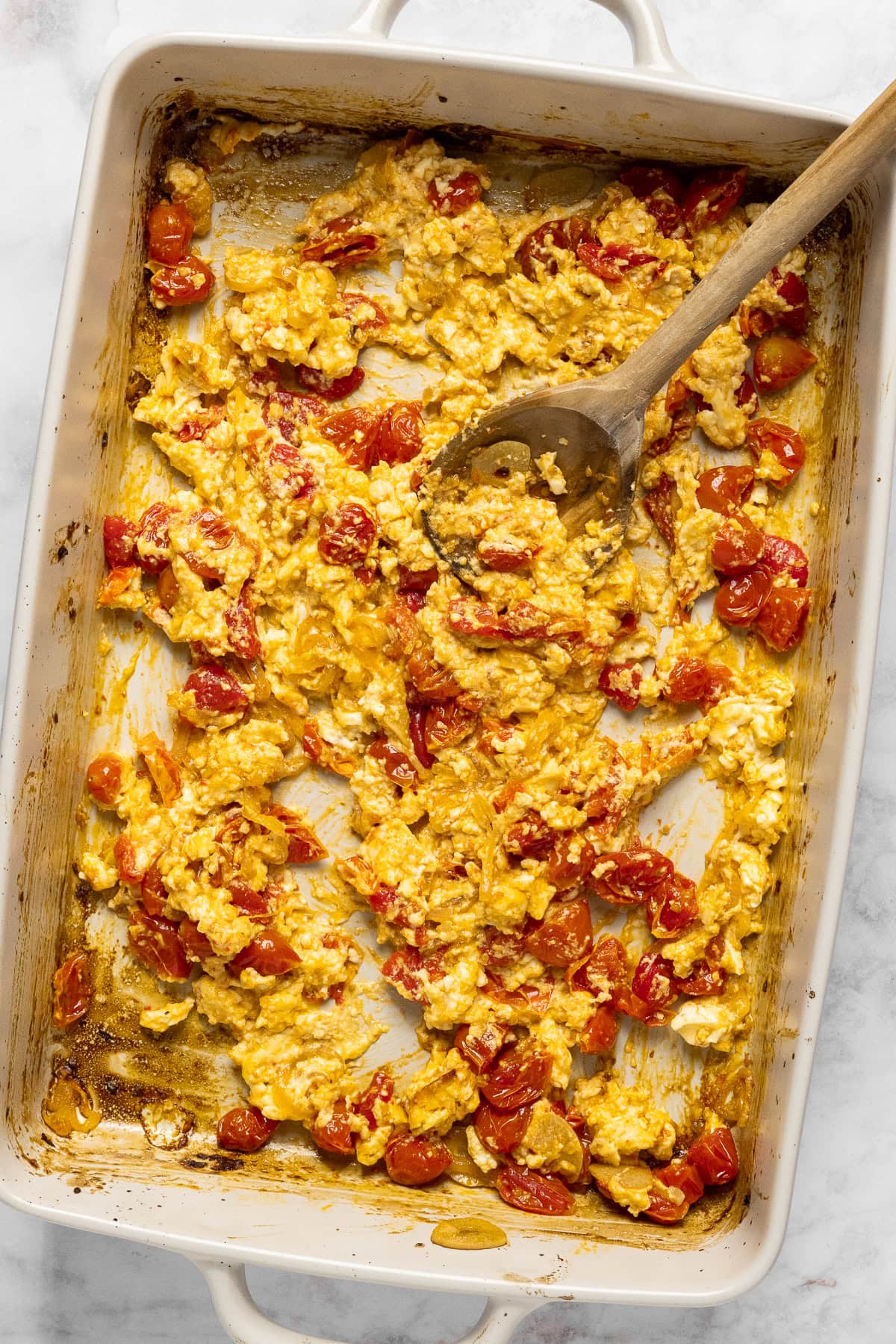 Using a spoon, push the tomatoes to the side to create a space in the center and place the feta cheese there.