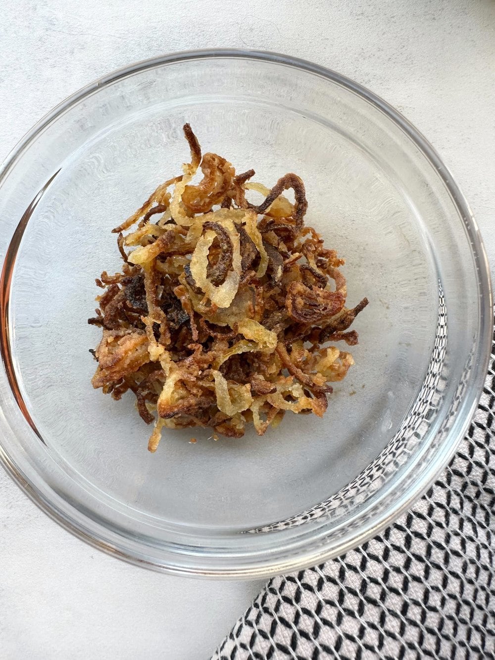 - Add olive oil to a large pan over medium high heat. Add the shallots and fry, stirring frequently, until the shallots are golden brown and crispy (if your pan isn’t big enough, pour the oil and fry the shallots in batches). Place them on a paper towel to remove excess oil and set aside.