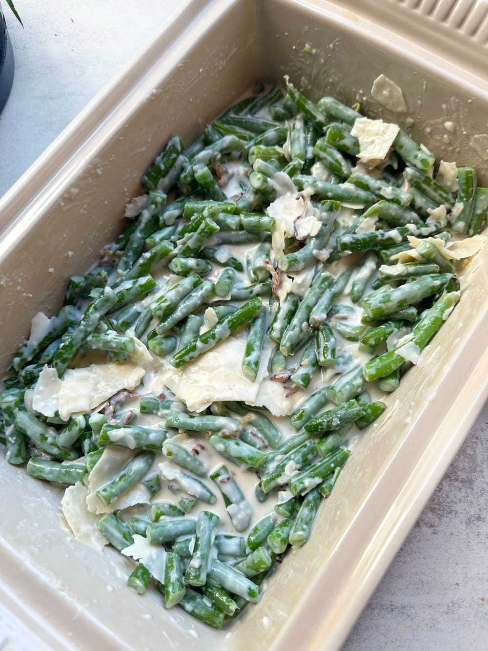 - Roughly chop the green beans into 1-inch pieces. Pour them into a greased casserole dish. Add the milk mixture, 1/2 cup of the crispy shallots, 1 cup of parmesan cheese and mix to combine.