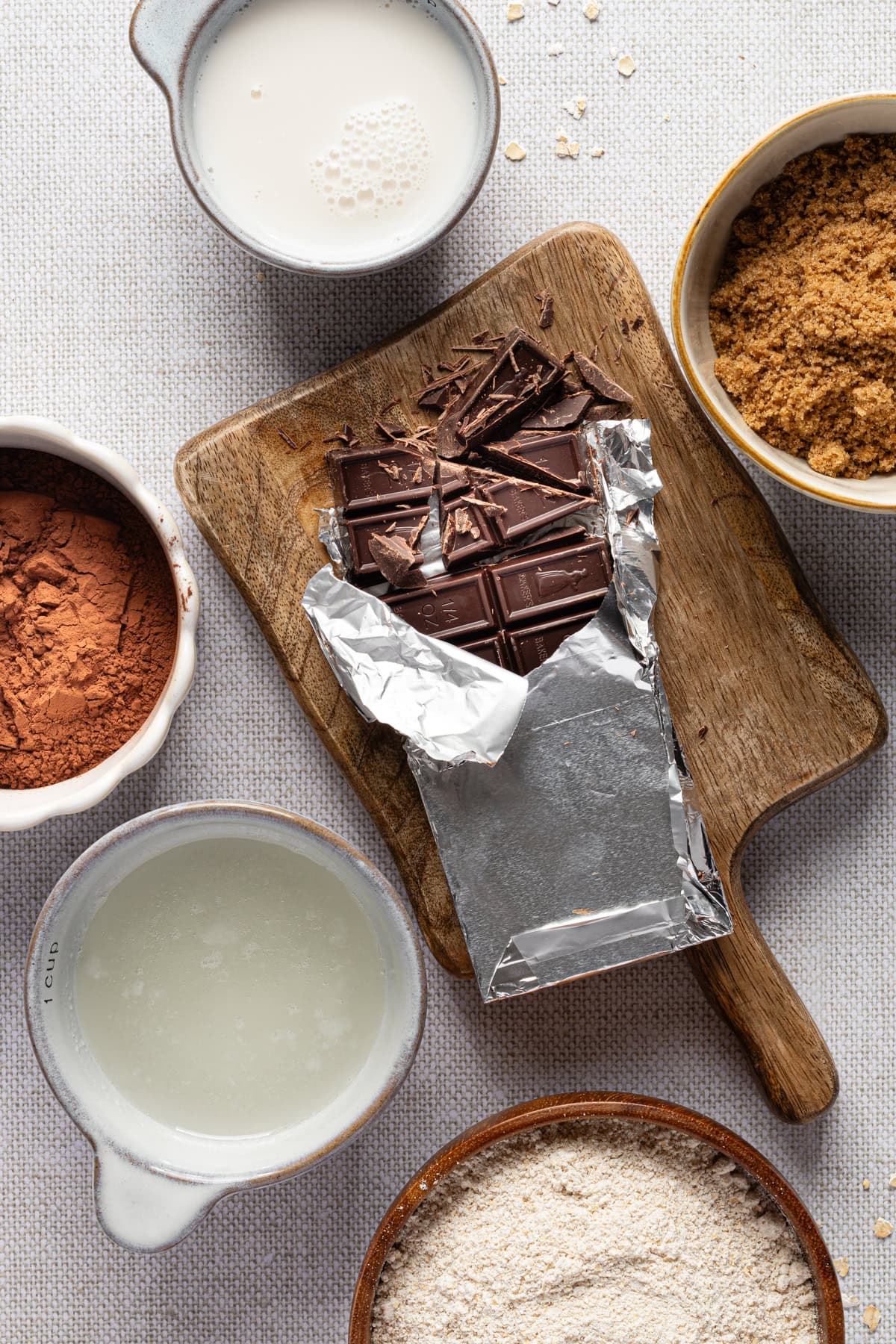 Ground the oat flour very finely. Get together the light brown sugar, unsweetened cocoa powder, melt the coconut oil, unsweetened almond milk, and baking chocolate bar.