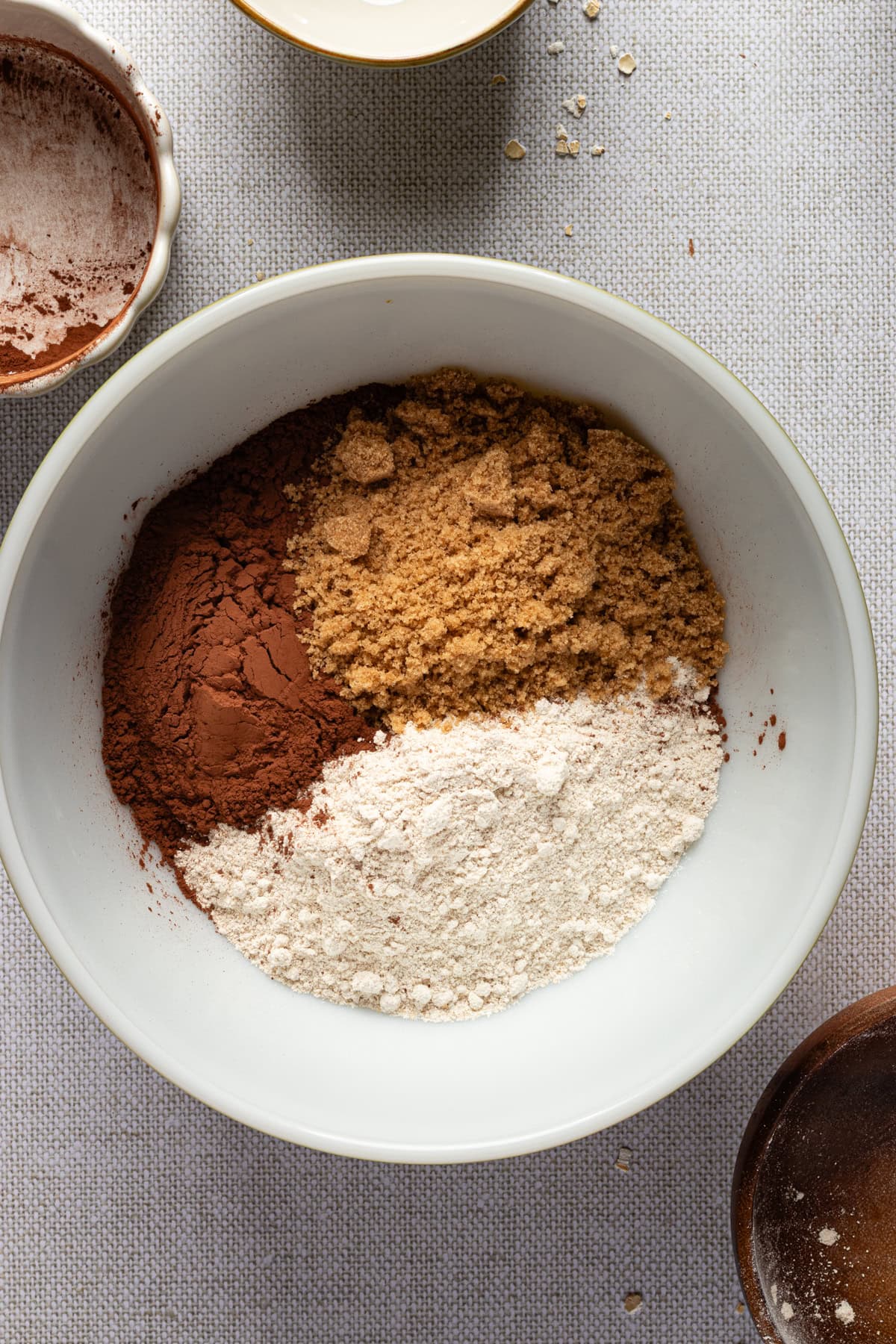 In a large bowl, add the oat flour, brown sugar, and cocoa powder.