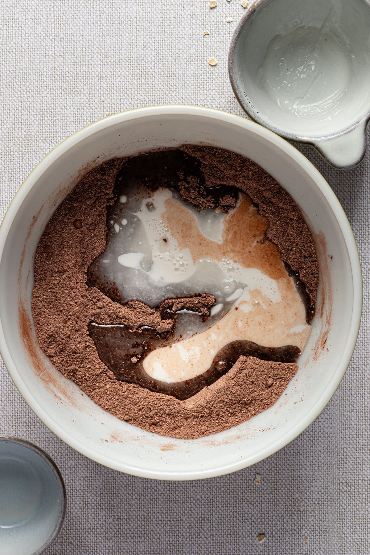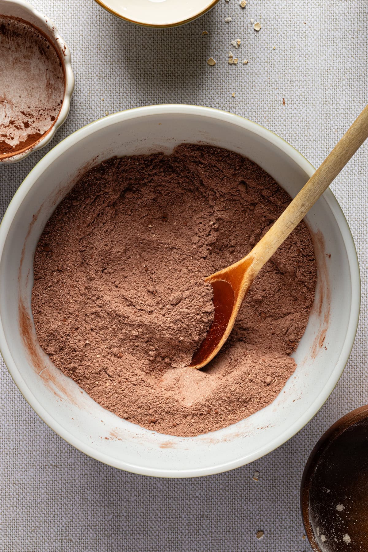 - In a large bowl, add the oat flour, brown sugar, and cocoa powder. Mix until thoroughly combined.