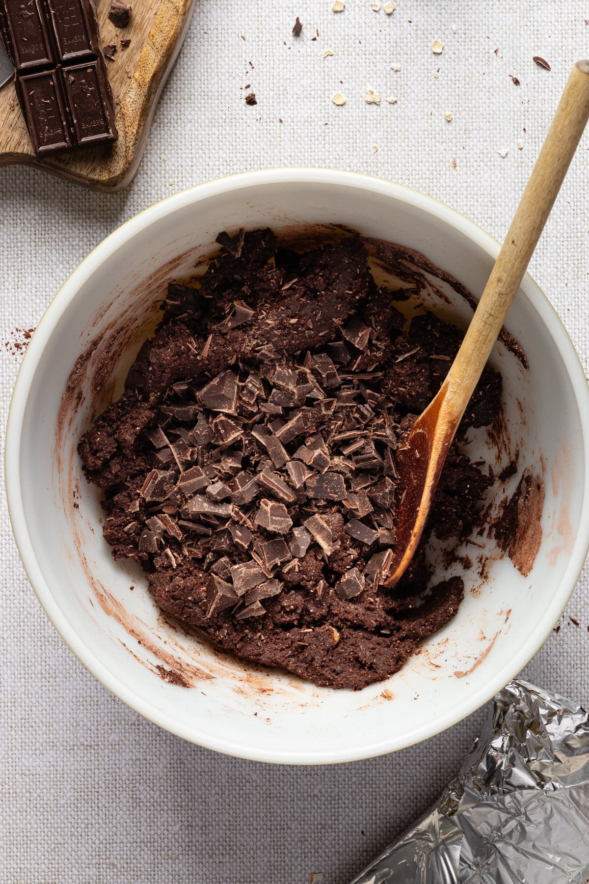 - Add the coconut oil and almond milk and mix until a cohesive batter forms. Fold in the chocolate chunks.