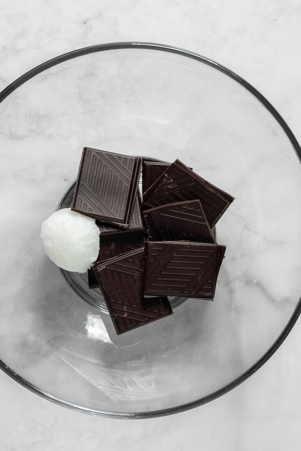 - Add the dark chocolate to a bowl with the coconut oil. Melt in the microwave by cooking on high for 2 minutes, stirring halfway through (alternatively, you can also melt chocolate using a double boiler on the stove).