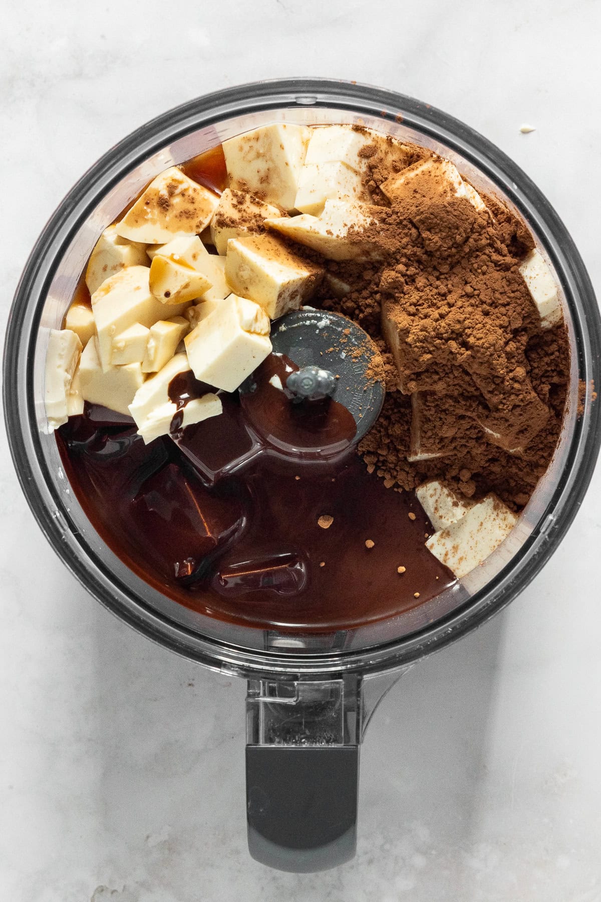 You’ll need dark chocolate, coconut oil, silken tofu, cocoa powder, and maple syrup.